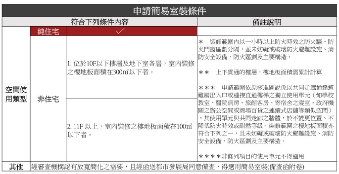 以下為符合申請簡易室內裝修審查條件的簡表: