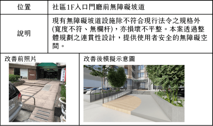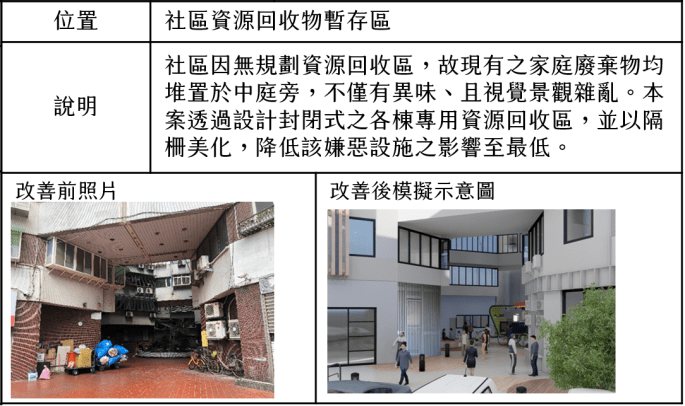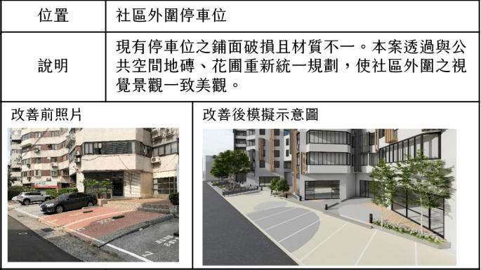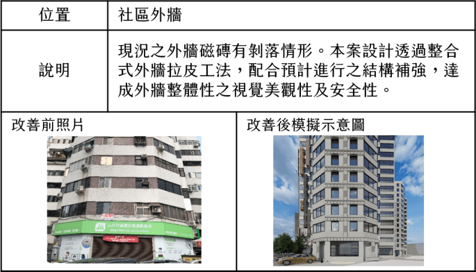 本案可區分三大整維需求項目,分別為外牆整新耐震補強公共環境改善。而其下子需求說明如下: