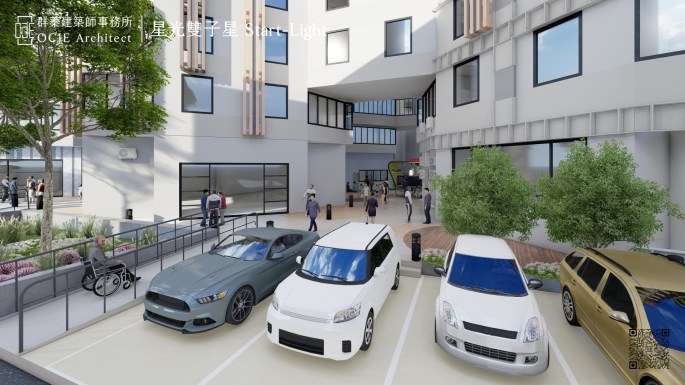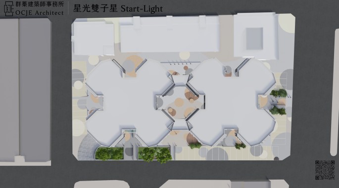 並將星光閃閃的概念運用於重新塑造社區外牆改造。本次整建其中一個重點在於改善外牆參差不齊的室外機, 我們在外牆輪廓中找標出住戶室外機的位置後,依照室外機的現況想像可能星光呈現的方式, 在不規律的室外機排列方式中利用木紋隔柵的特性試圖試圖找出另一種規律。並將星光效果藏在隔柵中,讓本案成為名符其實的星光雙子星。