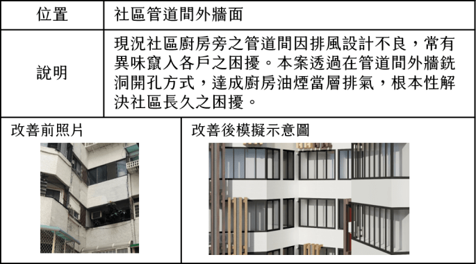 近年政府推動整建維護計畫雖以公寓型態為主,部分社區大樓因居民特性或基地條件而不具備重建之條件,整建維護則可以提供老屋更新之多元選項,突破既有重建思維以及拆與不拆的零和遊戲,創造都市更新更多更廣的實現可能性。