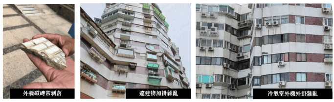 1.外牆整新:磁磚剝落、違建物(加窗、雨遮等)加掛、冷氣室外機外掛等問題;上述問題皆有潛在安全性危害,且亦影響居住品質,故其具有迫切之改善需求。